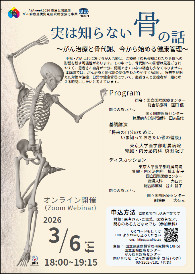 | 行事の概要 | 小児・AYA 世代におけるがん治療は、治療終了後も長期にわたり身体への影響を残す可能性があります。その中でも、骨代謝への影響は見過ごされやすく、患者さん自身が十分に認識できていない場合も少なくありません。 本講演では、がん治療と骨代謝の関係をわかりやすく解説し、将来を見据えた対策や治療、日常の健康管理について、患者さんと医療者が一緒に考える時間にしたいと考えています。 |